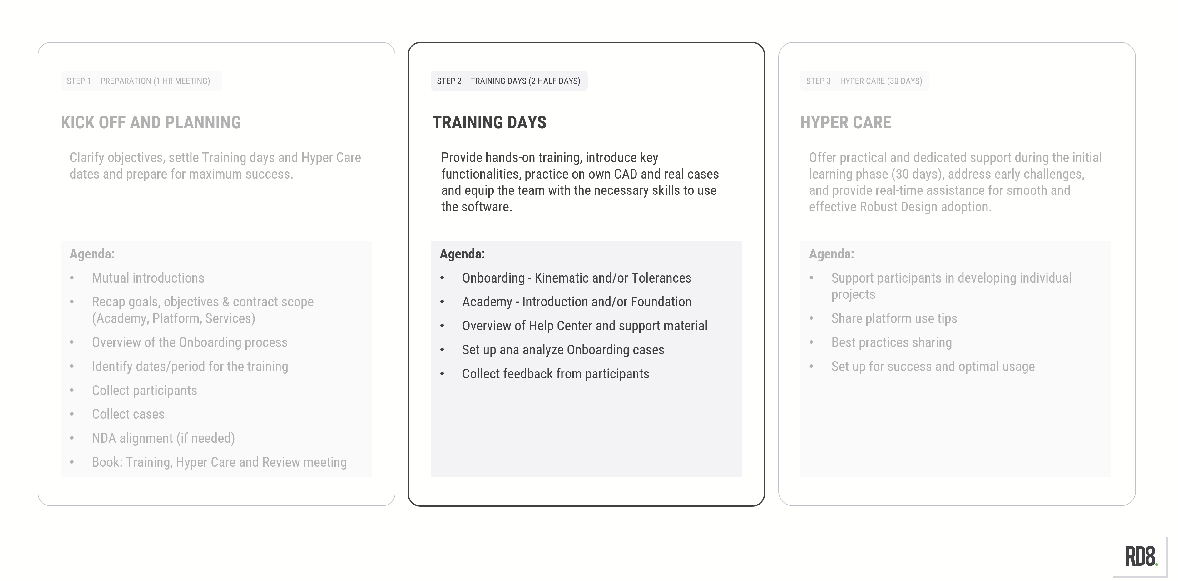 Goal: Provide hands-on training, introduce key functionalities, practice on customer own CAD cases and equip the customer’s team with the necessary skills to use the software.