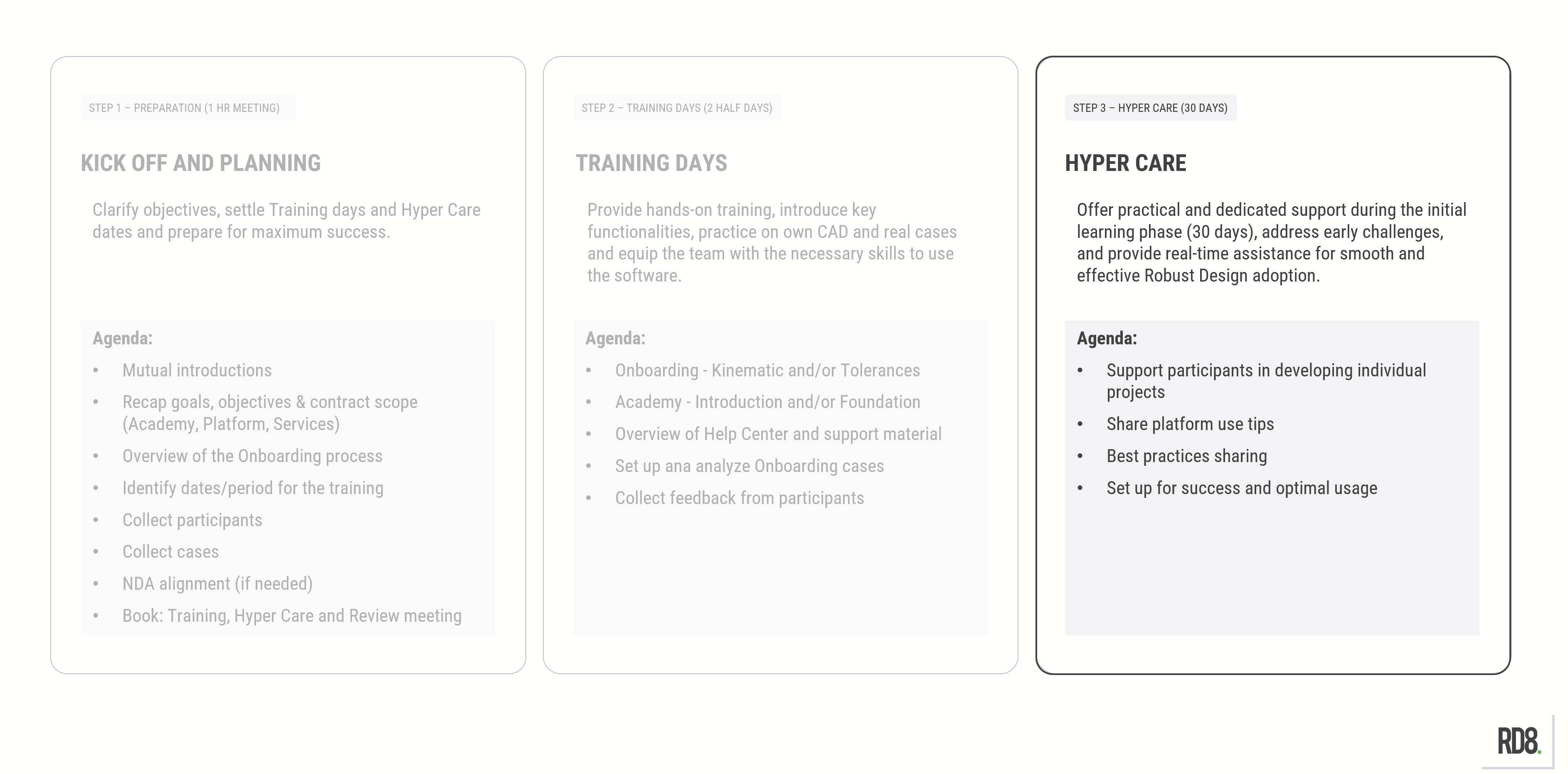 Purpose: Offer practical and dedicated support during the initial learning phase (30 days), address early challenges, and provide real-time assistance for smooth and effective Robust Design adoption.